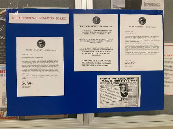 Your team will need to search out and find where the police department Bulletin Board is on the grounds. It has a blue backing with several important messages to help you find some evidence and clues.
